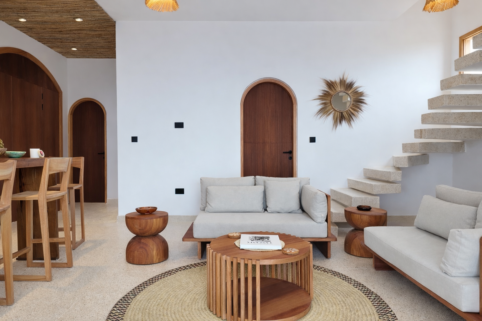 - Natural materials and open layouts